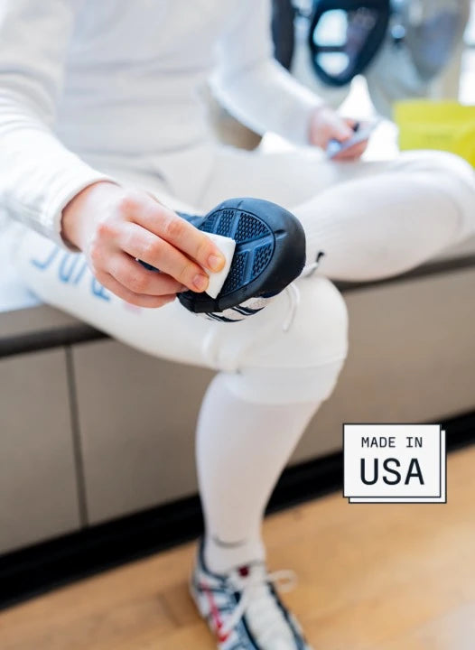 About 2-3 sprays will usually coat each outsole adequately. The goal is to evenly coat the entirety of both outsoles. Avoid getting any of it on the floor and apply it away from the playing area.