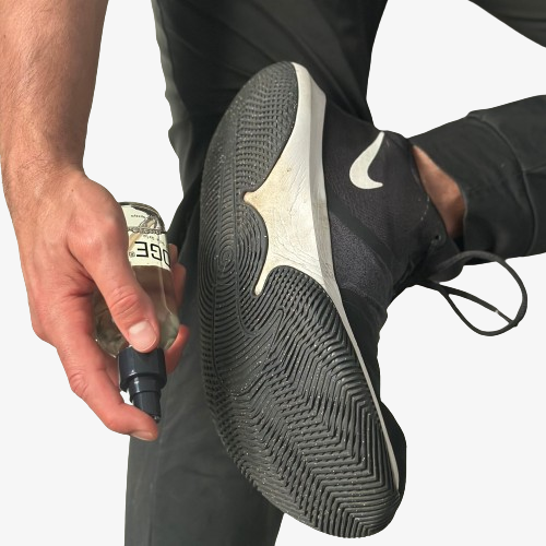 About 2-3 sprays will usually coat each outsole adequately. The goal is to evenly coat the entirety of both outsoles. Avoid getting any of it on the floor and apply it away from the playing area.
