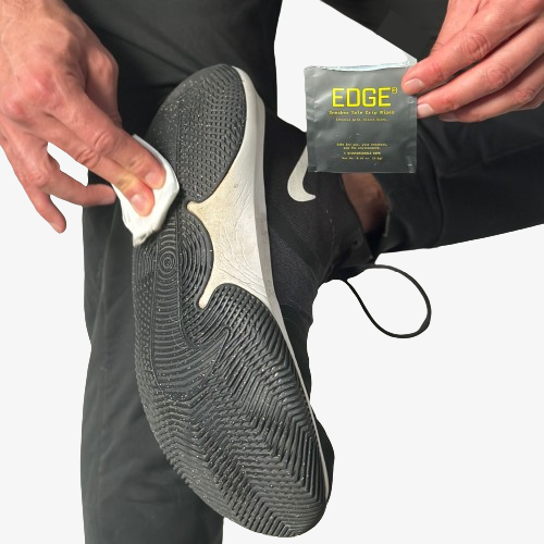 Simply apply just enough EDGE® to cover your sneaker outsoles (avoid getting any on the floor), wait 15 seconds for it to begin absorbing into the rubber, and then kick your shoes against the floor on the sidelines a few times to lock in the enhanced grip. The effect will last for hours, but it’s most noticeable within the first 10 minutes. Many athletes choose to reapply EDGE® during breaks because it’s so easy, dries fast, and has an instant effect. Note, the more you use EDGE®, the longer your outsole enhancement will last, because there is a cumulative effect.